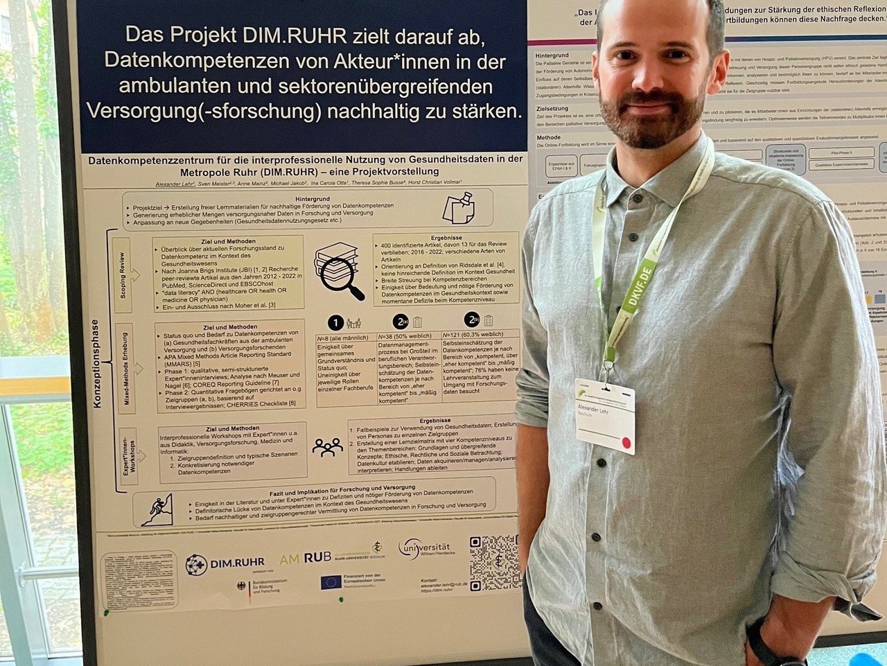 Stellvertretend für das Konsortium wurde von Alexander Lehr (Abteilung für Allgemeinmedizin – AM RUB, Ruhr-Universität Bochum) das Projekt “DIM.RUHR” und übergreifend die abgeschlossene Konzeptionsphase, in Form einer Kurzpräsentation und eines Posters im inhaltlichen Strang "Wissen verbreiten und vermitteln", vorgestellt. Neben Vorträgen zu Erkenntnissen über die Wirksamkeit verschiedener Verbreitungsmethoden und Erfahrungsberichten aus Forschungsprojekten und anderen Initiativen, bot dieser Strang eine Plattform für Aus- und Weiterbildungsprogramme sowie Fortbildungsangebote im Bereich der Versorgungsforschung und Implementierungswissenschaft. Die Thematik inspirierte zu vielfältigen Diskussionen rund um die Themen Datenkompetenz und Digitalkompetenz, Open Educational Resources sowie deren technische und praktische Umsetzung.